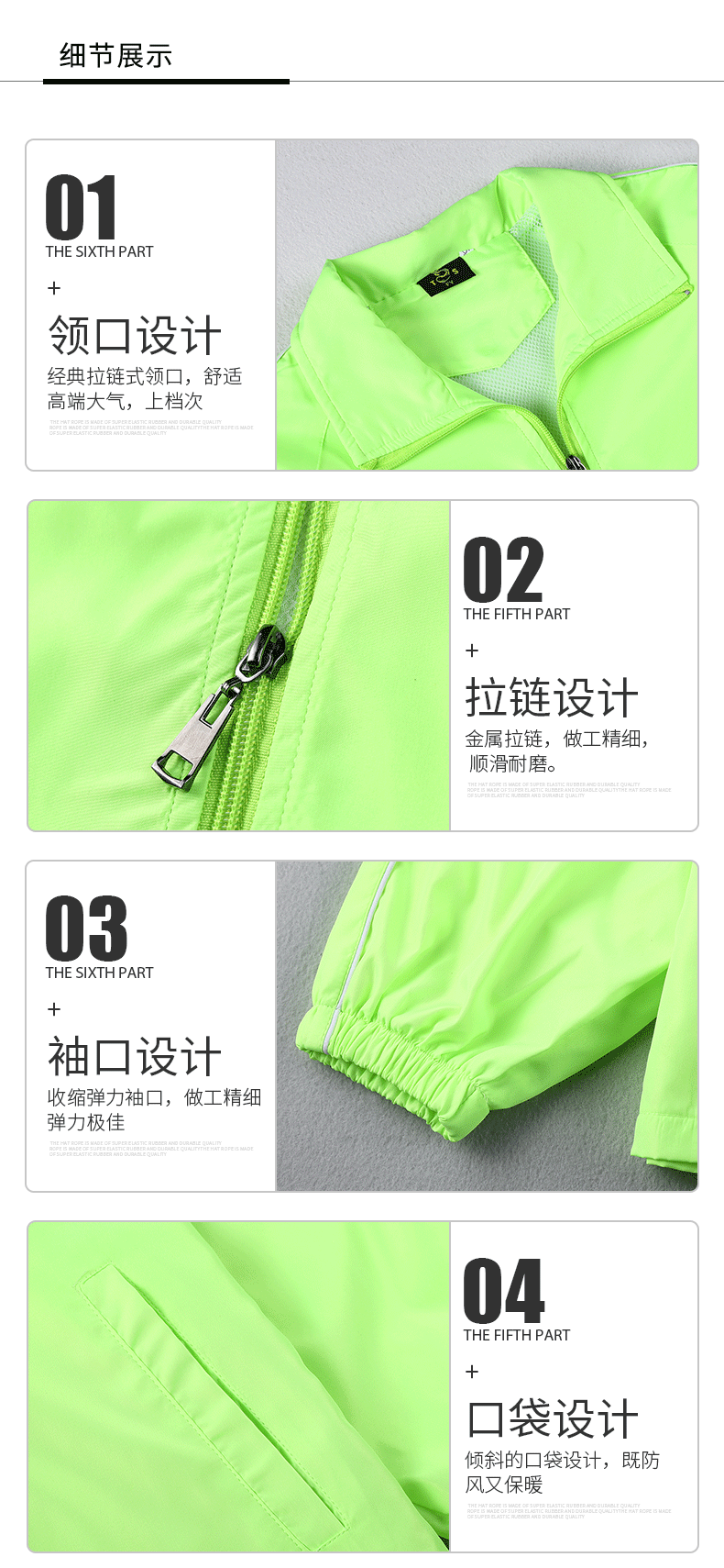 6种尺码 12种颜色 100%聚脂纤维面料经典拉链式领口,舒适高档大气,上档次。金属拉链,做工精细,顺滑耐磨。收缩弹力袖口,做工精细,弹力极佳。倾斜的口袋设计,既防风又保暖。品质面料,手感柔软,吸湿透气,易洗易干,穿着舒适。